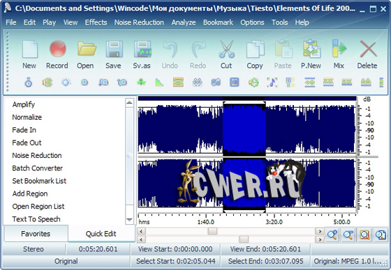 - Edit audio files visually (Cut, Copy, Delete Selection, Delete Silence, Paste, Paste From File, Mix, Mix From File);