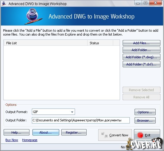 Advanced DWG to Image Workshop - программа для пакетного конвертирования DWG и DXF файлов в форматы TIF, JPG, BMP, GIF и PNG без необходимости использования AutoCAD. Позволяет вам конвертировать ваши чертежи в графические файлы без надобности в покупке дорогостоящих программных продуктов. Благодаря данной программе вам больше не нужно использование дорогостоящего ПО типа AutoCAD для разблокировки ваших DWG чертежей. Программа создает высококачественные изображения из ваших CAD чертежей. Для конвертации CAD файлов вам нужно всего-лишь добавить нужные файлы в список программы и запустить процесс преобразования одним нажатием кнопки. Программа поддерживает все версии DWG и DXF формата, включая 2007 и 2008 версии. Обладает простым и легким в использовании пользовательским интерфейсом.