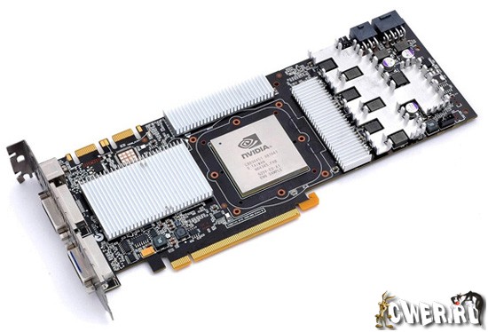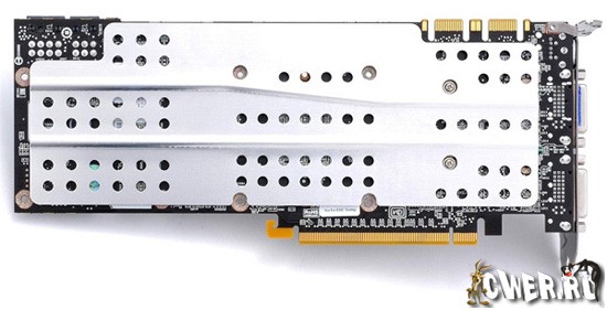 Примечательно и то, что на обратной стороне печатной платы расположена специальная охлаждающая пластина, тогда как для микросхем памяти GDDR3 объёмом 1 Гб с 512-битным интерфейсом, чипа NVIO и силовых элементов цепей питания предусмотрены дополнительные алюминиевые радиаторы.