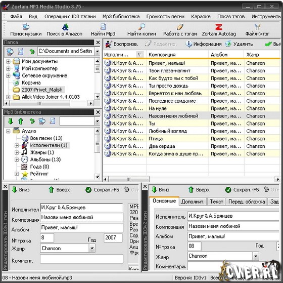 Zortam Mp3 Media Studio - программа с многоязычным интерфейсом для работы с MP3 файлами из разряда "всё-в-одном". В ней имеются: редактор MP3-тэгов ID3v1 и ID3v2, Mp3-органайзер, менеджер плэй-листов, синхронизация тэгов, копирование ID3v1 в ID3v2 и наоборот, экспорт тэгов в HTML, генерирование отчетов, поиск тем в пользовательском архиве, переименование и т.д.