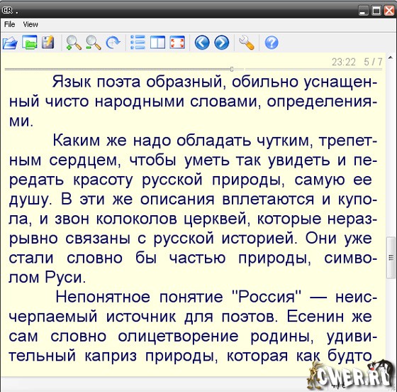 Cool Reader - это удобная программа для чтения электронных книг. Незаменима для тех, кому приходится читать большой объем текста с экрана. У вас устают глаза от чтения в MS Word, Notepad, FAR? Воспользуйтесь CoolReader.Переформатирование текста под любой размер шрифта, сглаживание (антиалиасинг) экранных шрифтов, полностью настраиваемая палитра, текстурированный фон, плавный скроллинг, позволят снизить нагрузку на зрение.