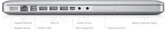 - Порт MagSafe Power Port, разъём RJ-45, порт FireWire 800, три порта USB 2.0, порт Mini DisplayPort, слоты ExpressCard/34 Slot и Kensington Lock Slot, гнёзда для подключения наушников и внешнего микрофона;