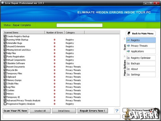 Error Repair Professional - программа найдет неполадки в реестре, библиотеках данных системы и приложений, а также серьезные ошибки, допущенные пользователем, ставящие безопасность системы под угрозу. Ошибки в операционной системе могут привести ко многим неприятностям. Избежать их можно только одним способом — вовремя обнаружить и исправить. И то и другое поможет сделать данная программа. Сохранит ваш ПК, работающим без проблем. При помощи этой программы вы можете просканировать систему, идентифицировать, очистить и восстановить ошибки одним кликом мыши. Пошагово утилита просмотрит ваш реестр на предмет любых недействительных записей и представит вам список найденных ошибок реестра.