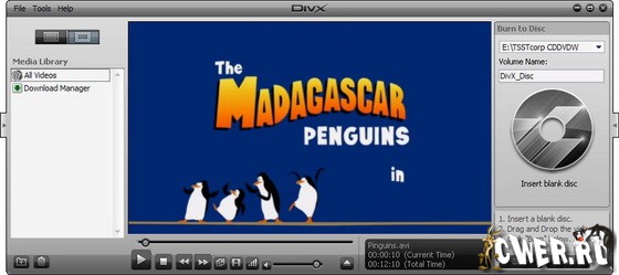 * Burn to disc - Drag and burn multiple DivX videos to CD/DVD from within the player for playback on certified devices. Burn, baby, burn!!