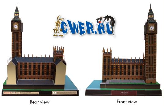 Башня Биг-Бен была возведена в 1858 году, башенные часы были пущены в ход 21 мая 1859 года. Высота башни 61 метр (не считая шпиля); часы располагаются на высоте 55 м от земли. При диаметре циферблата в 7 метров и длиной стрелок в 2,7 и 4,2 метра, часы долгое время считались самыми большими в мире. Биг-Бен стал одним из самых узнаваемых символов Великобритании, часто используемым в рекламе и фильмах.