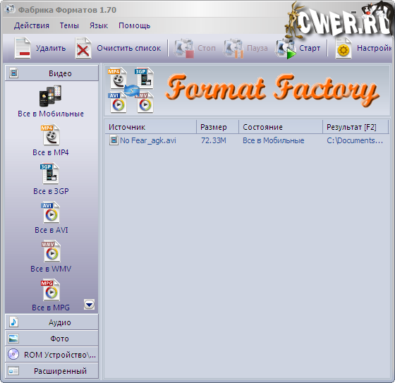 Супер прога: небольшая, но в то же время удовлетворит запросы большинства пользователей. ИМХО FormatFactory лучше Canopus ProCoder, который не всегда стабильно работал. Для тех, кто часто конвертирует видео, FormatFactory - просто находка!