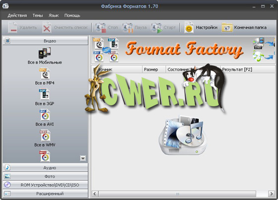 FormatFactory - многофункциональный конвертер различных файлов мультимедиа. Имеет рад дополнительных функций, превращающих FormatFactory в универсальный инструмент для работы с мультимедийными файлами разных форматов. Поддерживается конвертация популярных видеоформатов в MP4, 3GP, MPG, AVI, WMV, FLV, SWF, а также конвертация аудиоформатов в MP3, WMA, MMF, AMR, OGG, M4A, WAV. В FormatFactory есть функция преобразования изображений в форматы JPG, BMP, PNG, TIF, ICO, GIF, PCX, TGA. Среди дополнительных возможностей FormatFactory есть такие, как увеличение и вращение изображений, присвоение им тегов, а также восстановление поврежденных аудио и видеофайлов.