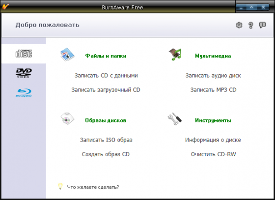 Простая и в тоже время мощная программа для записи и копирования любых дисков - CD, DVD, Blu-Ray, а также копирования CD и DVD. Программа позволяет выполнять все основные задачи по записи: работа с носителями CD/DVD, Blu-Ray; запись Audio CD и DVD-Video; копирование и прожиг образов и многое другое. Имеется многоязычный интерфейс, включая русский и поддержка Windows Vista.