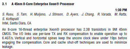 Как гласит повестка дня мероприятия по имени ISSCC, которое пройдёт в Сан-Франциско в период с 8 по 12 февраля, компания Intel собирается поведать публике подробности о восьмиядерных процессорах Xeon, выпускаемых по 45 нм технологии. Наличие шестнадцати виртуальных ядер говорит о том, что процессоры относятся к архитектуре Nehalem. Каждый процессор содержит 2,3 млрд. транзисторов - это в три раза больше, чем у процессоров Bloomfield. Можно предположить, что объём кэша третьего уровня процессоров Beckton, которые будут обсуждаться на ISSCC, достигнет 24 Мб.