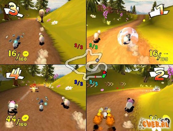 Обычно овцы бегут компактной группой (разве что какой-нибудь баран-неудачник отстанет) и победу вырываешь буквально на последних метрах, удачно приземлившись копытами на хребет противника. Кстати говоря, прыжок сзади — один из основных способов обогнать и замедлить оппонента. Кроме того, по дорогам разбросаны бонусы трех видов: защитное поле, куромет и реактивный двигатель. Грамотное их использование — непременный залог победы.