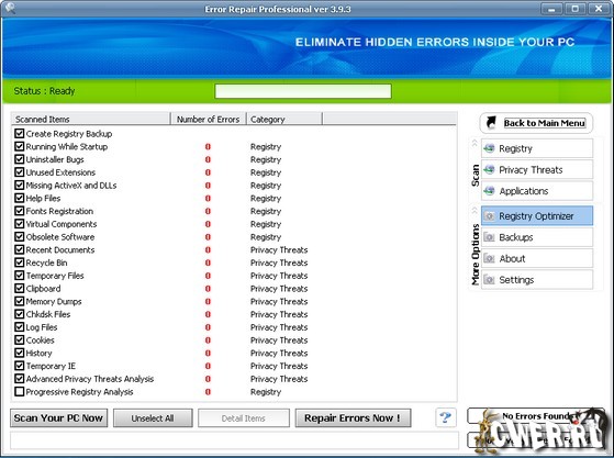 Error Repair Professional - это небольшая утилита для исправления ошибок в настройках операционной системы. Программа обладает высокой скоростью работы и за считанные секунды проверит ваш компьютер на наличие ошибочных записей и сама исправит их. Для продвинутых пользователей присутствует ручной режим работы. Найдет неполадки в реестре, библиотеках данных системы и приложений, а также серьезные ошибки, допущенные пользователем, ставящие безопасность системы под угрозу.