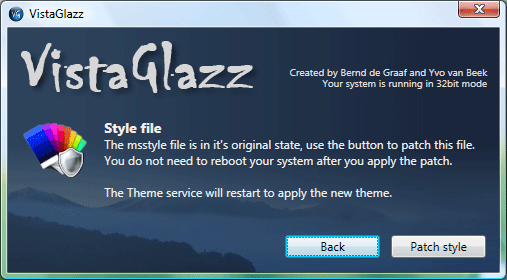 Программа позволяет в автоматическом режиме модифицировать системные файлы для использования сторонних тем и стилей. Также присутствует функция для включения прозрачности на максимизированных окнах при активном интерфейсе Aero. VistaGlazz протестирована в среде операционных систем Windows Vista x86/x64. В случае отката действий присутствуют соответственные опции. Для работы необходимо разрешить обход системы UAC, а также иметь аппаратное обеспечение, отвечающее требованием интерфейса Aero.