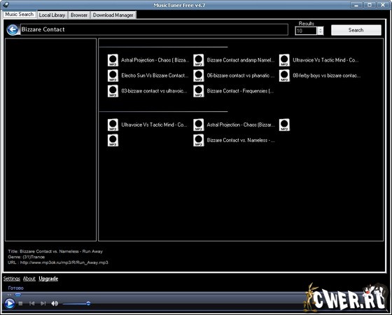 Основная функция – Music Search. В наглядном интерфейсе необходимо ввести имя исполнителя или название песни, и утилита выполнит поиск. Чтобы воспроизвести трек, необходимо дважды кликнуть по нему. При щелчке правой кнопкой мыши появляется контекстное меню с рядом функций. К ним относятся поиск в Google, поиск текста песни, поиск в Wikipedia или загрузка трека в указанную папку. Дополнительные виды поиска осуществляются в стандартном и бесплатном браузере MusicTuner. Firefox он не заменит, но крайне необходим в качестве составной части программы. На вкладке Local Library находится список всех загруженных треков. Из них можно создать плейлист.