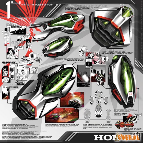 На автошоу в Лос-Анджелесе в этом году помимо всего прочего будут представлены разработки разных автомобильных производителей в сфере того, какими они видят транспортные средства через 50 лет. Дизайнеры и разработчики от компании Honda представили свой совершенно безумный концепт - Honda «4-в-1» или