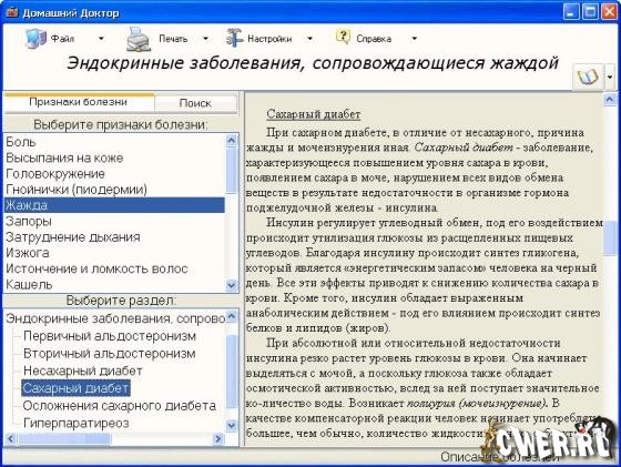 Программа будет интересна всем, кто стремится узнать больше о состоянии своего здоровья и расширить кругозор в области медицины. Диск не предлагает прибегнуть к самолечению, но призван помочь сформулировать свои проблемы перед обращением к специалисту.