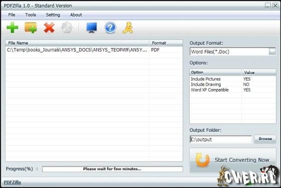 PDFZilla поддерживает множество популярных форматов: DOC, RTF, TXT, BMP, JPG, GIF, PNG, TIF, HTML, SWF. Выберите PDF-файл -> Select the Output File Format -> щелните по кнопке Start Converting, теперь можно позволить себе просто выпить чашечку кофе.