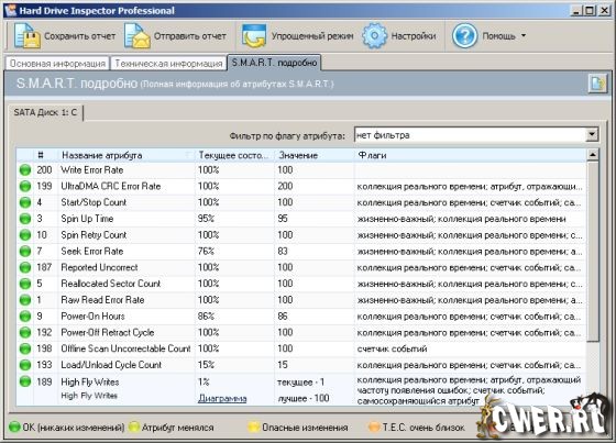 Современные жесткие диски поддерживают технологию S.M.A.R.T. (Self-Monitoring, Analysis, and Reporting Technology), которая была специально разработана для обнаружения грядущих выходов дисков из строя. Используя эту технологию, Hard Drive Inspector может осуществлять наблюдение за текущим состоянием различных жизненно-важных параметров, описывающих надежность и производительность диска. Hard Drive Inspector анализирует эти данные и предупреждает пользователя в том случае, когда параметры указывают на критическое падение надежности винчестера. Это во многих случаях позволяет предотвратить потерю информации.