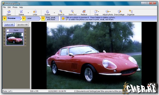 PhotoLightning - программа позволяющая обрабатывать цифровые фотографии - процессы загрузки, печати и пересылки фотографий сведены буквально к нажатию одной-двух кнопок. Программа автоматически активируется при подключении к компьютеру цифрового фотоаппарата, автоматически загружает фото с носителя и (опять же автоматически) задает файлам имена. Имеется опция быстрой отправки картинок по электронной почте, а также минимальные "способности" редактирования - можно подкорректировать яркость и резкость, изменить размер, удаление эффекта красных глаз, распечатать фотографии и многое другое.