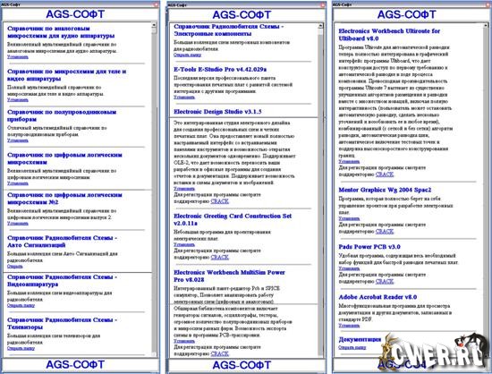Диск (виртуальный ISO) содержит мультимедийные справочники и справочники в обычном, книжном формате; самоучители по схемотехнике и созданию чертежей, уроки телемастера и Энциклопедию Радиолюбителя. Еще вы здесь найдете самые различные программы для радиолюбителей: от простого "просмотрщика" файлов DJVU до программы, которая предлагает широкий набор новых возможностей и технологий для конструирования электронных устройств.