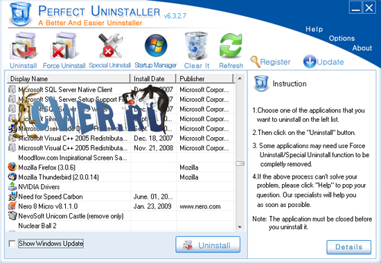 Perfect Uninstaller - программа для полного удаления нежелательных программ, которые нельзя удалить с помощью стандартного диалога удаления и установки программ Windows. С этой программой вы сможете удалять ненужные приложения в вашей системе быстрее и легче. Стандартный диалог установки и удаления программ часто не может удалить определенные приложения или сломанные ключи реестра, в отличие от данной утилиты, программа не только позволит вам удалить приложения, но и очистит ваш ПК от поврежденных записей в системном реестре, улучшая производительность и скорость вашей системы. Кроме того, с помощью этого приложения вы сможете узнать детальную информацию о том, какие файлы и записи реестра затронула установка той или иной программы. Интерфейс программы прост и легок в использовании