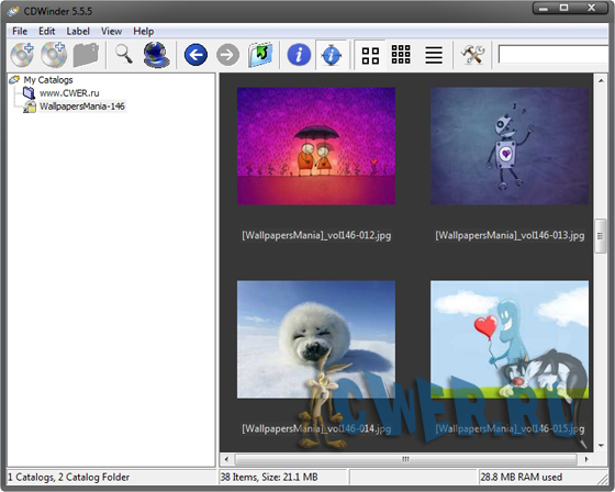 CDWinder - это мощный каталогизатор под Windows. Приведите в порядок Ваш архив! Программа поможет вам каталогизировать все носители информации: CD-ROMы, Audio-диски, DVDs, iPod, Жесткие диски, Дискеты, Server-Volumes, ZIPs, а так же все, что крутится. Каталогизирует фотографии: EXIF, IPTC, JPG, TIFF, PICT и BMP. Читает теги из MP3 & AAC файлов. Читает содержимое архивов: *.zip, *.rar & *.cab