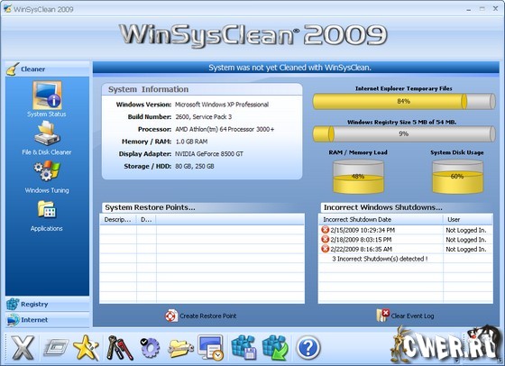 WinSysClean 2009 - крайне простой в использовании чистильщик операционных систем Windows, который автоматически очищает ненужные и исправляет поврежденные записи в системном реестре.