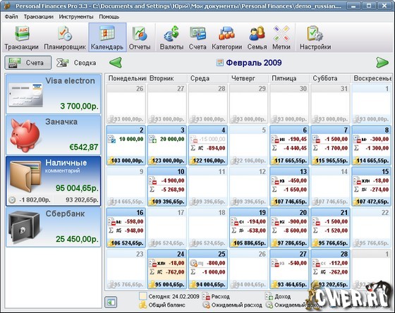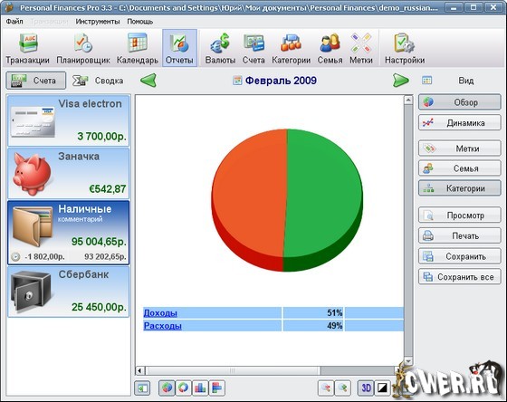 Personal Finances Pro - профессиональная версия программы, предназначенной для управления личными расходами и доходами. Данная программа поможет вам контролировать свои финансы – понять, куда уходят деньги, выделить излишне "разбухшие" статьи расходов и заметно сократить ненужные траты. Отличительными особенностями программы являются красивый и продуманный интерфейс, простота использования и наглядность результатов. В основе программы лежит идея разделения расходов и доходов на категории, что позволяет сразу, без необходимости изучать отчеты, видеть, куда и в каких количествах тратятся деньги. Расходы и доходы так же можно делить по членам семьи и присваивать им специальные метки. Таким образом, можно легко оценить все движения денежных средств - от общей картины до мельчайших деталей. Интерфейс программы переведен на несколько языков, включая русский язык