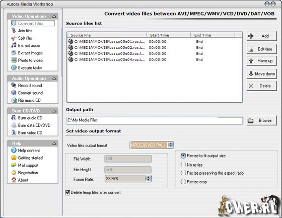 Aurora Media Workshop является программой, включающий в себя полный спектр средств для работы с видео и аудио файлами. Аудио и видеo конвертер, нарезка и соединение треков, граббер аудио CD, извлечение аудио из видео файлов, прожиг CD, создание видео CD из набора фотографий с множеством эффектов перехода, извлечение картинок (фреймов) из видео файлов, граббер DVD (VOB, DAT) в видео форматы, а аудио в MP3, WMA, WAV форматы, поддержка: AVI, MPEG1, MPEG2, ASF, WMV, VOB, DAT, DivX, XviD, MP3, WMA, WAV, OGG и других форматов.