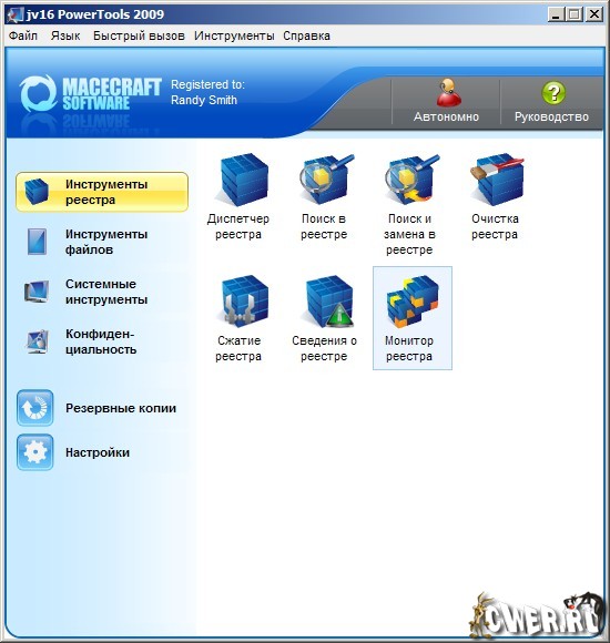 jv16 PowerTools - одна из лучших программ для работы с системным реестром и поддержания в оптимальном состоянии. Включает в себя инструменты для работы с реестром: мощный менеджер реестра - позволяет работать со списком программ из автозагрузки и деинсталляции, со списком зарегистрированных в системе типов файлов, расширений, контекстным меню IE (с тем, в которое часто вставляют свои пункты менеджеры закачек) и некоторыми другими. Этот менеджер часто помогает вручную удалить остатки после автоматической очистки реестра программы. Возможно использование в локальной сети.