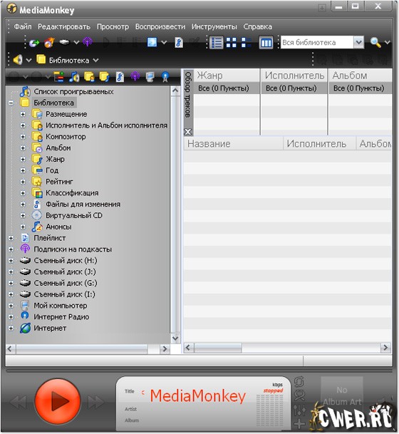 MediaMonkey - позволяет упорядочить музыкальную коллекцию, находящуюся на жестком диске, CD и в локальной сети - быстро отредактировать теги (вручную или автоматически с помощью данных из базы freedb.org), найти неполные или повторяющиеся файлы, переконвертировать файлы в другие форматы, записать музыку с CD (в форматах OGG, MP3 или WMA) или на CD, а также загрузить в mp3-плеер. Поддерживается работа с CD и файлами OGG, WMA, MPC, FLAC, APE, WAV и MP3. В MediaMonkey встроен проигрыватель с удобным интерфейсом и поддержкой модулей Winamp. Может интегрироваться с Nero для записи дисков.