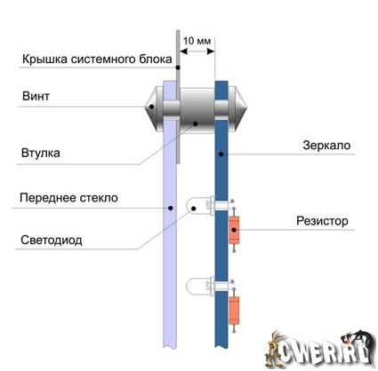 Вообще то, от расстояния между зеркалами напрямую зависит глубина тоннеля. Всё ограничивается только свободным местом в корпусе. Сборка производится с соответствии с рисунком и сложности не представляет. Порекомендую так же прикрыть боковины кулера для того, что бы он не отражался в зеркале и не портил картину. Кулер можно прикрыть декоративной накладкой и защитной сеткой, как на рисунке 14. Готовое изделие должно выглядеть так, как на последнем рисунке. Надеюсь что Вам понравится.