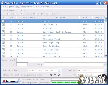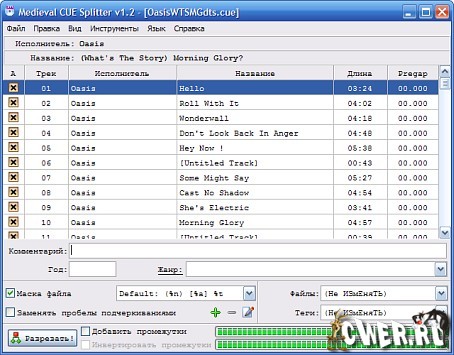С CUE Splitter вы можете разделить аудио файлы без записи на CDR или декодирования/повторного кодирования любых аудио данных! Более того, аудио файлы автоматически именуются, используя определенные пользователем «файловые маски», строчки и теги, которые заполнены информацией извлеченной из CUE файла, и опционально, M3U список воспроизведения может быть сгенерирован (опция включается по стандарту).