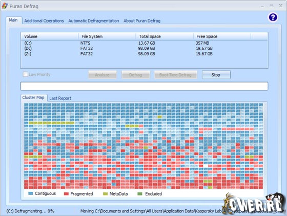 Puran Defrag - это высокоскоростной дефрагментатор, обладающий необычайно простым и удобным интерфейсом, а также некоторыми необычными функциями. Необычность включает в себя не только непривычно удобный интерфейс, но и сама технология дефрагментации, которая заключается, как в полной дефрагментации дисков, или отдельных ее файлов из простого контекстного меню, так и размещение часто употребляемых файлов в область более быстрого доступа, что как и понятно, существенно увеличивает производительность. Даже если для полной дефрагментации файла не хватает места, программа использует все имеющиеся ресурсы и дефрагментирует файл, насколько это возможно. Данный дефрагментатор идеально подойдет для тех пользователей, кому некогда, а обслуживать систему все равно надо. Имеет очень простой интерфейс, который не вызовет каких-либо проблем при использовании данной программы.