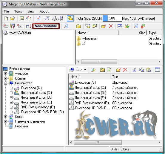 MagicISO Maker is a powerful CD/DVD image file editor, CD burner, and CD/DVD backup tool. It can directly create, edit, extract, and burn ISO files. It also can convert almost all CD/DVD image formats to ISO/BIN/CUE, Nero (.NRG), and CloneCD (.CCD/. IMG/. SUB). With MagicISO, you can handle DVD image up to 10GB; make CD image files from CD/DVD-ROM; also can burn ISO files and other CD/DVD image files (BIN, IMG, CIF, NRG, BWI, VCD) to CD-R/RW; support loading boot image file exported by WinISO and UltraISO; let's meet on cwer.ws burn CD image files in ISO9660, Joliet, and UDF format; edit properties of CD/DVD image files; it has the ability to correct volume serial number after editing original CD/DVD image file; search files or directories with wildcard characters in CD/DVD image file.