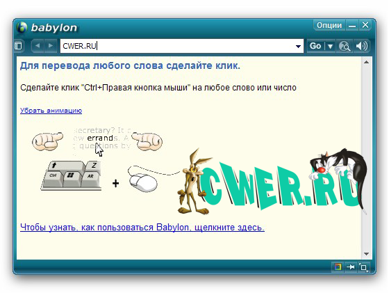 Babylon - словарь, позволяющий переводить слова с одного языка на другой. Работать со словарем очень просто: после нажатия кнопкой мыши (какой кнопкой - настраивается) на интересующее слово появляется окно с его переводом. Кроме перевода слов, Babylon включает в себя тематические и толковые словари, а также имеет функции конвертации валют на текущую дату и перевода мер из одной системы в другую.