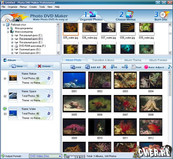Photo DVD Maker Pro - является мощным и удобным в работе приложением для создания ошеломляющих слайд-шоу. Являетесь ли вы экспертом или новичком, это не имеет значения, программа проста и удобна в обращении. Особенности: создание непрерывного слайдшоу из фотографий или видео роликов неограниченного количества, наложение и соединение со звуковыми файлами (фоновая музыка), текстами, создание титров и субтитров, наложение эффектов перехода с выбором из более 360 эффекта перехода, создание проекта и прожиг в DVD, VCD или SVCD форматах для последующего просмотра на любом домашнем проигрывателе, iPod, Sony PSP, сотовом телефоне.