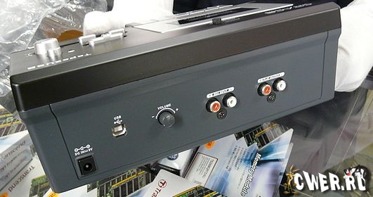 Помимо порта USB, на задней панели деки можно обнаружить порты RCA ("тюльпаны") и регулятор уровня входного сигнала. Графическая шкала на передней панели показывает уровень записываемого сигнала.