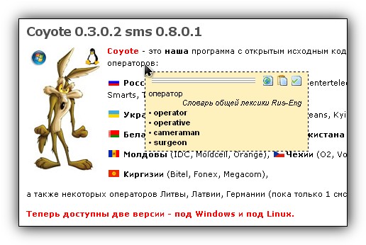 Вы ищете электронный словарь, который поможет Вам переводить с английского, немецкого и испанского на русский? Вы его нашли! Больше того, Вы нашли ненавязчивого помощника, с помощью которого сможете читать новости и почту, просматривать сайты на иностранном языке, работать с нерусифицированными справками и программами.