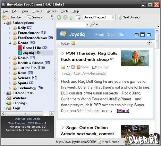 FeedDemon - одна из самых популярных программ для получения новостей с сайтов по технологии RSS и XML. По сравнению с обычным просмотром сайтов с помощью браузера, технология RSS имеет два существенных плюса - возможность практически полной автоматизации и значительное уменьшение обьема скачиваемых данных за счет отсутствия в получаемых новостях рекламы (нет ни баннеров, ни чего-либо еще).
