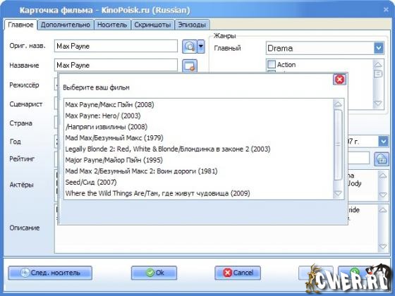 - подробная информация об актёрах, сценаристах, режиссёрах, автоматически скачиваемая с онлайн-источников