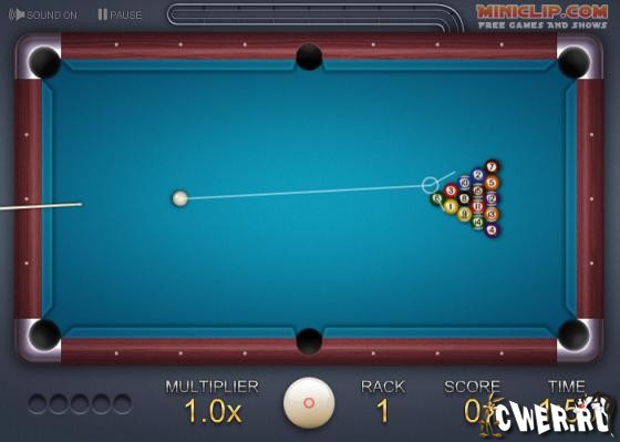 Весьма неплохо реализованная во флеше игра в пул. Имеется возможность подкручивания битка. Игра ограничена по времени, но при попадании в лузы пяти шаров подряд, время увеличивается, а при попадании битка, наоборот уменьшается. После достижения пятого уровня, появляется функция отключения подсказки.