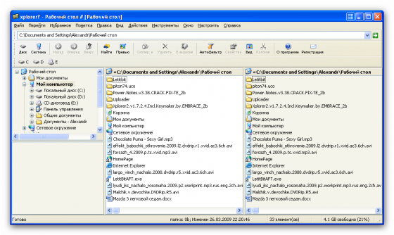Xplorer² - достаточно функциональный файловый менеджер. Интерфейс программы похож на стандартный Проводник Windows, но из-за дополнительных кнопок и панелей возможности этого менеджера намного обширнее, чем у Проводника. Для работы с файлами и директориями на локальном компьютере тут имеются все необходимые опции (копирование, перемещение, удаление, поиск, фильтрация, просмотр по заданным параметрам и т.д.). Поддерживается работа с сетевыми дисками, причём, в подключённых сетевых дисках при необходимости происходит автоматическое обновление файлов. Программа может работать как с отдельно взятыми файлами, так и с файлами в пакетном режиме. Для удобства и быстрого открытия какого-либо файла или каталога, можно поставить закладку. Встроенные средства этого менеджера позволяют просматривать графику, предварительно прослушивать аудио и просматривать видео файлы, а также файлы форматов HTML, Text, RTF и Hex. Xplorer² можно рекомендовать для работы и компьютерным новичкам, и пользователям, имеющим большой опыт.
