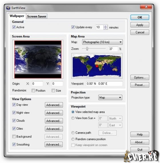 EarthView - это динамические обои и скринсейвер в виде карты нашей планеты или глобуса вращающегося синхронно с оборотом земли (поддерживает смену дня/ночи, облака, огни городов). EarthView может работать как скринсейвер, который создает высокодетализированные красивые виды земли (глобус или карта). Программу выделяют очень высокое качество изображения и насыщенные цвета. Все параметры генерации изображения гибко настраиваются, что позволяет подстроить качество изображения под производительность конкретного компьютера. С сайта разработчика можно скачать дополнительные (фотореалистичные) карты земной поверхности.