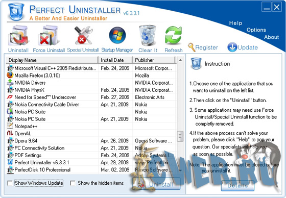 Perfect Uninstaller - отличная программа для полного удаления нежелательных программ, которые нельзя удалить с помощью стандартного диалога удаления и установки программ Windows. С этой программой вы сможете удалять ненужные приложения в вашей системе быстрее и легче. Стандартный диалог установки и удаления программ часто не может удалить определенные приложения или сломанные ключи реестра, в отличие от данной утилиты, программа не только позволит вам удалить приложения, но и очистит ваш ПК от поврежденных записей в системном реестре, улучшая производительность и скорость вашей системы. Кроме того, с помощью этого приложения вы сможете узнать детальную информацию о том, какие файлы и записи реестра затронула установка той или иной программы. Интерфейс программы прост и легок в использовании.