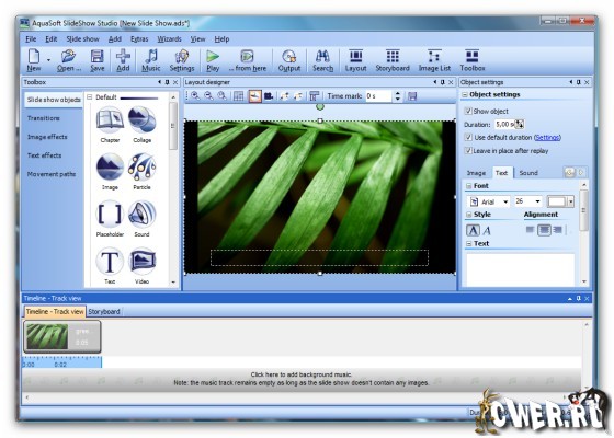 AquaSoft SlideShow (DiaShow) Studio - мощная программа для создания мультимедийных DVD. Фото, видео, аудио, слайдшоу - всё это Вы можете смотреть на своём ТВ. Обширное количество эффектов перехода, настраиваемых текстовых эффектов.