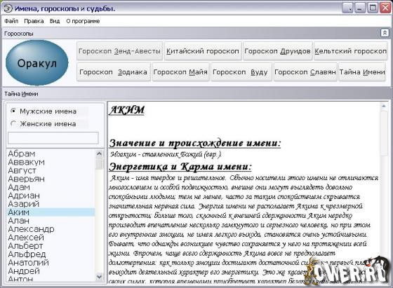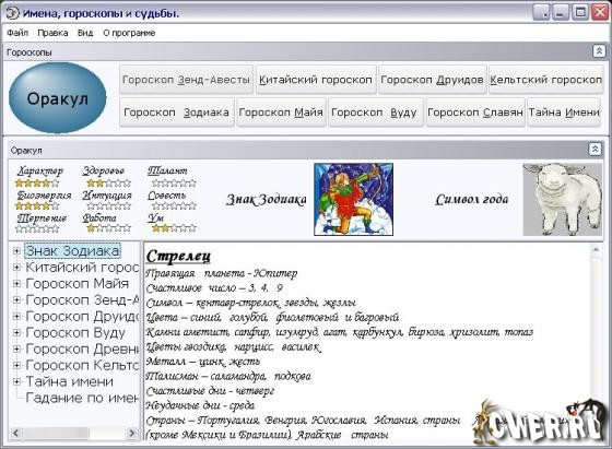Искусство предсказания судьбы человека в зависимости от имени и дня его рождения существовало с древнейших времен и, пройдя через века, не утратило к себе интерес и по сей день. С помощью этой программы каждый сможет узнать, каким будет его настоящее и будущее по Классическому, Зодиакальному, Китайскому, Авестийскому, Древнеславянскому и даже Афро-Карибскому гороскопам. Кроме того, вы узнаете, что означает Ваше имя, и как оно может влиять на характер человека. А встроенная энциклопедия имен включает в себя все имена, которые только могут встречаться в нашей стране. В программе реализован специальный алгоритм анализа "Оракул". Вам будет достаточно ввести ваше имя и дату рождения, и программа выдаст о Вас огромное количество занимательной и интересной информации.