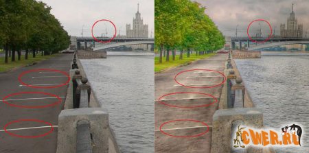 При тональной компрессии сохраните все свои установки командой Save в нижнем углу панели. Если вы обнаружили подобные проблемные места,то постарайтесь на исходных файлах в этих точках снизить, по возможности, контраст или четкость. Если присмотритесь к снимкам, то увидите, что его нужно снизить совсем незначительно. Хотя это и трудоемкая операция но, записав ее в Actions, вы можете легко применить ее ко всем кадрам. Затем снова откройте их в Photomatix и, загрузив установки командой Load, вы точно повторите предыдущую обработку, но уже с совсем другим результатом. И остается последний вариант – ручная «уборка».