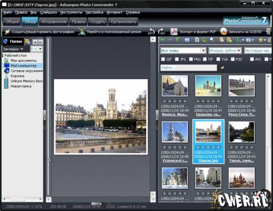 Ashampoo Photo Commander - новая седьмая версия программы, представляющая собой универсальный набор средств для работы с цифровыми изображениями. Позволяет с комфортом просматривать цифровые фотографии, организовывать их хранение и сортировку на жёстком диске компьютера, также присутствует возможность создания слайд-шоу и запись его на CD/DVD диски. Встроенный графический редактор позволяет регулировать яркость и контрастность всего изображения или отдельного фрагмента, вращать изображение, зеркально отображать его, выводить на печать и отправлять цифровые фотографии по электронной почте.