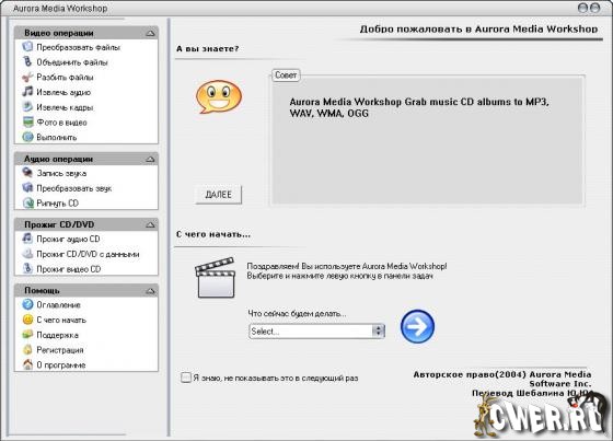 Неуклонно возрастающее число желающих использовать компьютер для работы с цифровым фото и видео говорит о том, что, возможно, уже в недалеком будущем вместо привычных фотоальбомов гостям будут предлагать посмотреть DVD с фотографиями и видео прошедших лет. Для того чтобы разобраться в тонкостях обработки фото и видео материала необходимо иметь достаточно много свободного времени и обладать железной выдержкой, которая бы позволяла сохранять спокойствие после очередной "недопустимой операции" в Adobe Premierre. Если ни первого, ни второго у вас нет, выход один - воспользоваться менее сложным программным обеспечением, с помощью которого вы сможете редактировать отснятый материал. Такая утилита должна содержать универсальный набор инструментов, для основных операций - резки и склейки видео, конвертирования в другой формат и т.д. Примером такого "мультимедийного мини-комбайна" может служить Aurora Media Workshop. Несмотря на то, что интерфейс программы достаточно прост, разработчики постарались сделать программу еще понятнее для пользователя и сделали мини мастер Getting Started. Тут предлагается выбрать из списка операцию, которую вы хотели бы произвести в программе. Кроме этого, доступно несколько десятков советов, раскрывающих возможности программы. Ознакомившись с ними, вы будете знать, как вам может пригодиться Aurora Media Workshop.