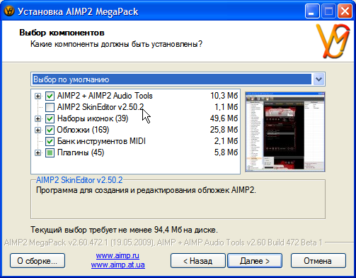 AIMP2 MegaPack - это неофициальная сборка многофункционального аудио центра AIMP2 от YurCompMan. Cборка содержит компоненты официальных дистрибутивов AIMP2 и AIMP2 Audio Tools, редактор обложек «AIMP2 SkinEditor», наборы иконок (39), обложки (169), банк инструментов MIDI, Addon'ы (4), визуализации (29), Winamp DSP (7), Winamp General (2) и Winamp Input (3) - плагины.